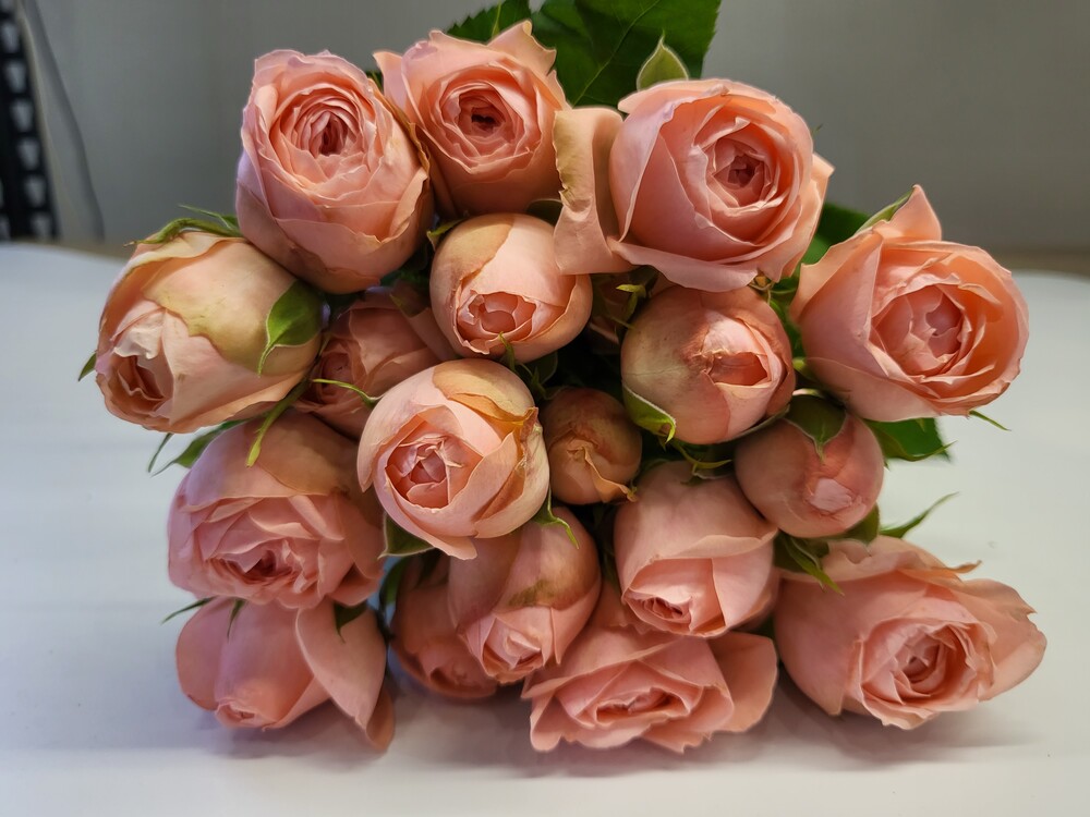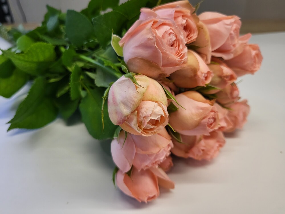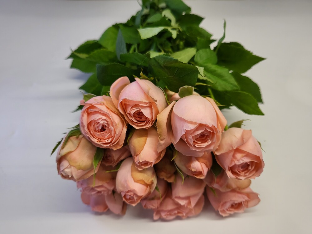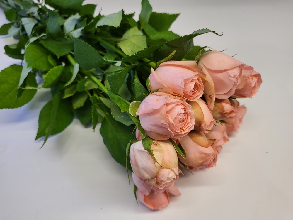 디그니티 장미는 살구핑크 빛을 가진 스프레이 장미 품종입니다. 스프레이 장미는 한 줄기에 여러 송이가 달린 장미를 말하며, 꽃잎의 안쪽으로 갈수록 핑크색의 그라데이션이 섞여있습니다.
