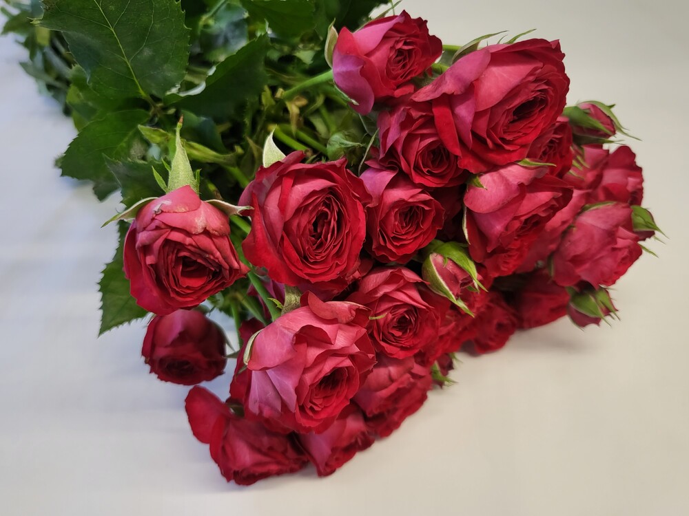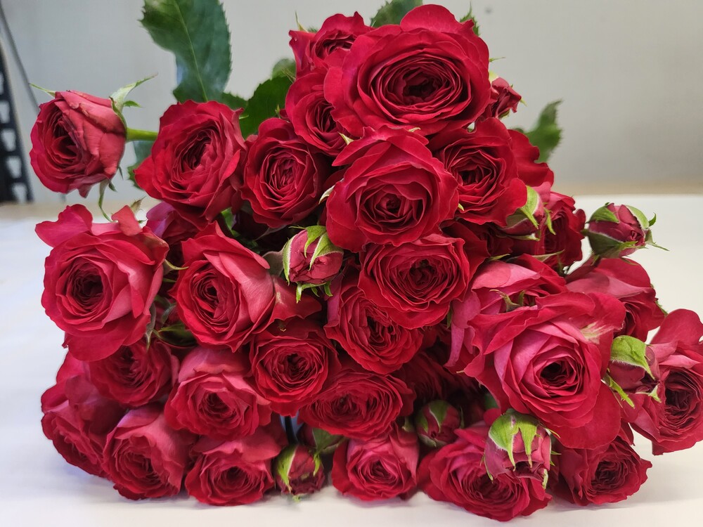 장미 레드윙은 빨간색의 스프레이 장미 품종 중 하나입니다. 스프레이 장미는 한 줄기에 여러 송이가 달린 장미를 말하며, 꽃잎의 안쪽으로 갈수록 검붉은색의 그라데이션이 섞여있습니다.