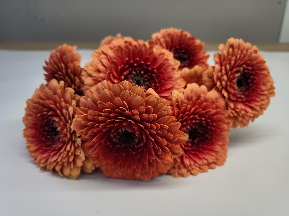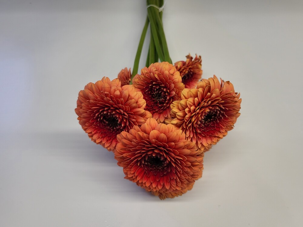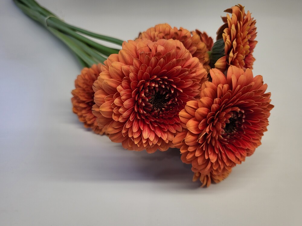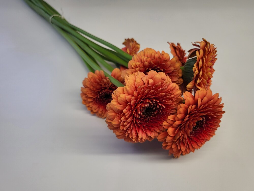 거베라 폼포니 문킥은 주황색 꽃잎을 가지고 있으며, 꽃잎이 둥글고 풍성한 것이 특징입니다.