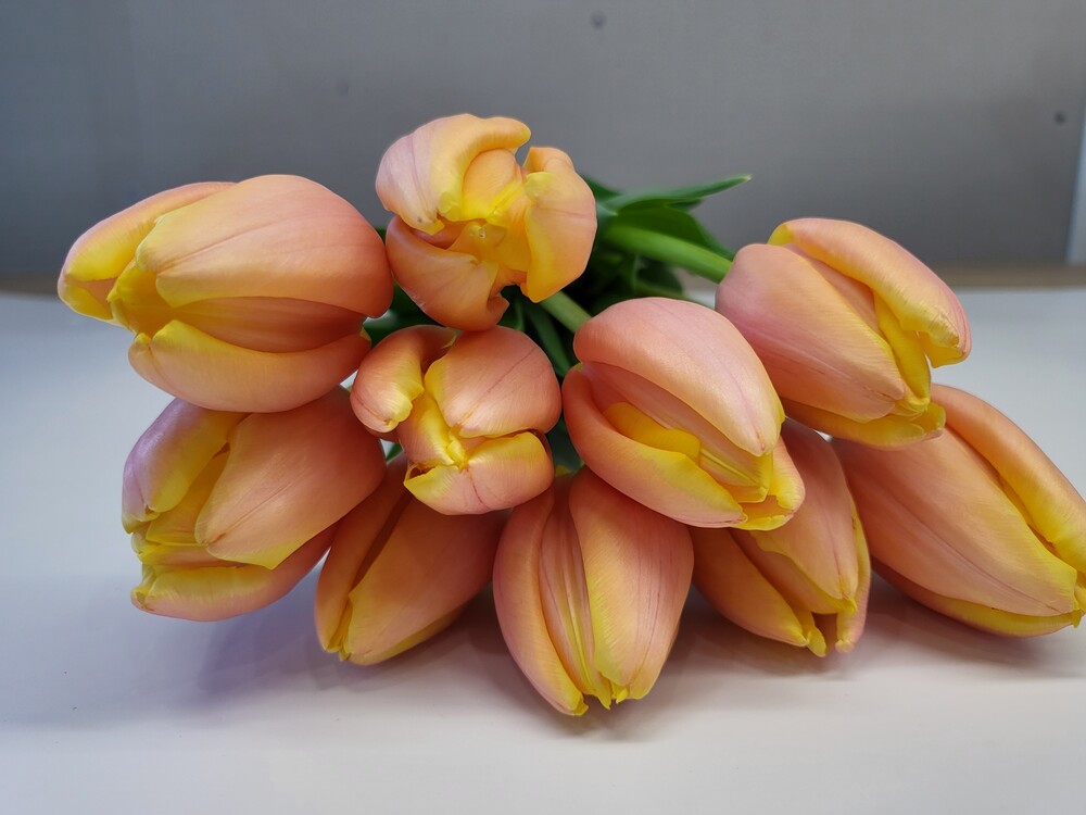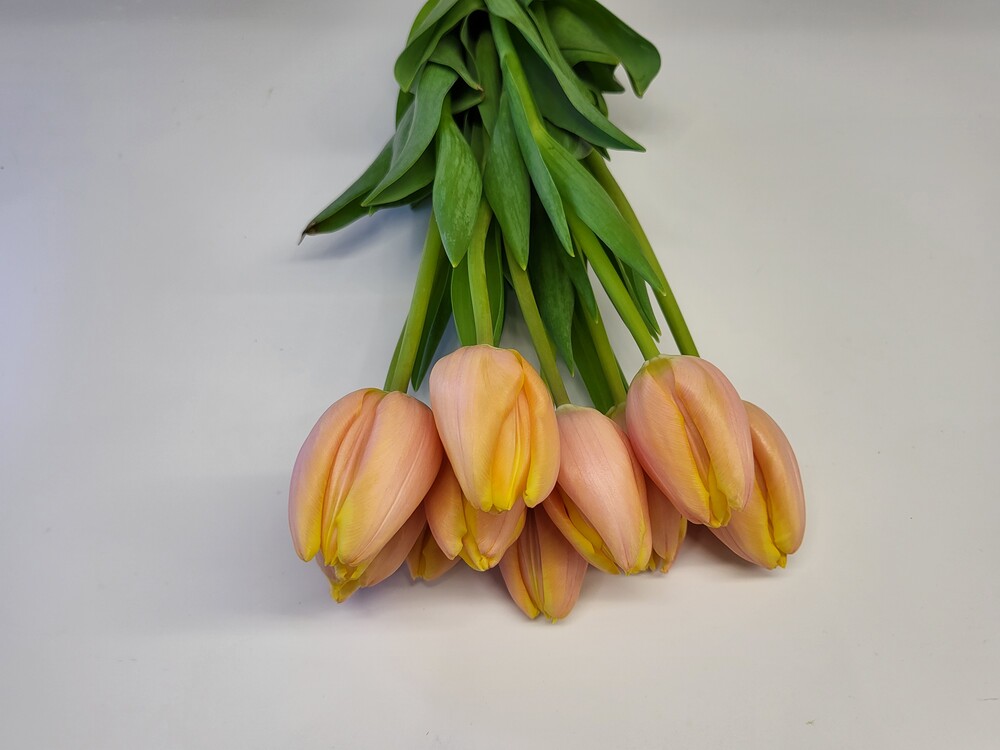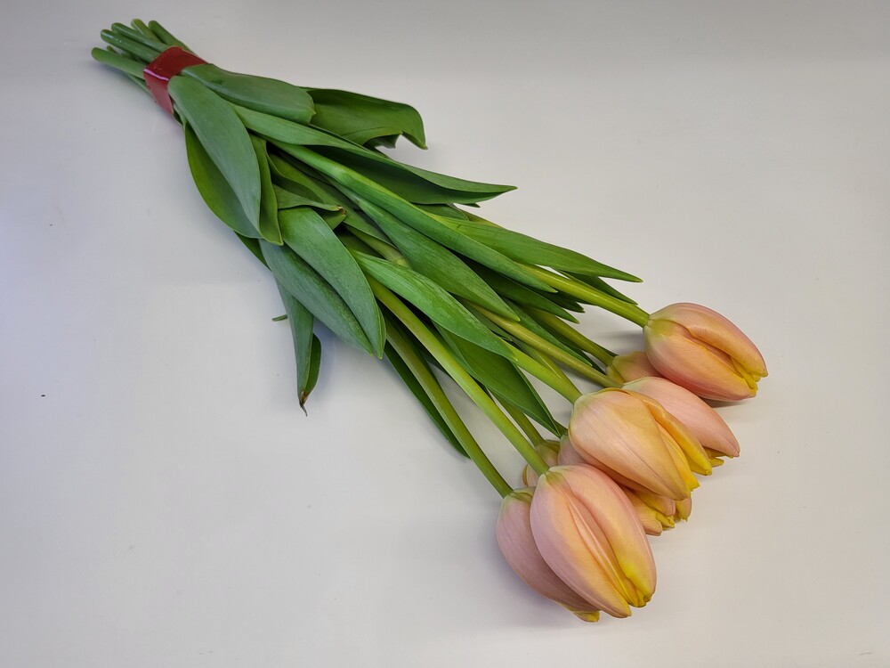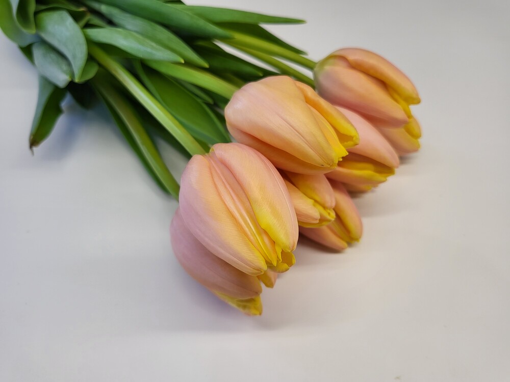 망고참 튤립은 살몬 핑크 계열의 고급스러운 색상을 가지고 있습니다.