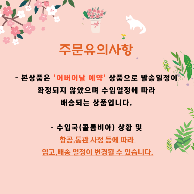 - 콜롬비아 현지사정 및 항공,통관 등에 따라 입고 예정날짜가 변경될 수 있습니다.